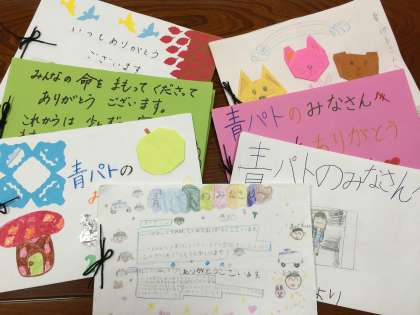 各クラスで行っている青パトさんの名前とメッセージを書くプリントが、少しずつ進んでいます。表紙はクラスによって自由に作ってもらっているので、個性にあふれ、これを見ただけで心が温まります。これからもよろしくお願いします。