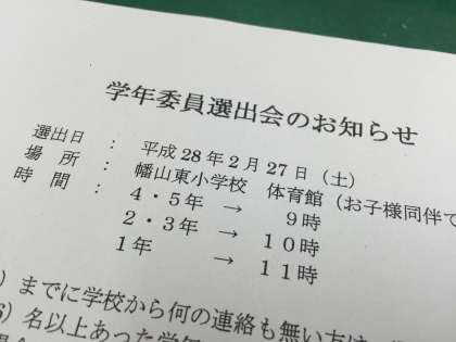 学年委員選出会について 公開日 2016/02/25 更新日 2016/02/25 PTA広報部 すでにプリントが配布されていますが、土曜日(27日)に学年委員の選出会が体育館で行われます。学年によって集合時間が異なっていますので、お間違えのないようにお集まりください。子どもたちのより良い教育環境のため、ご理解をいただけるとありがたいです。よろしくお願いします。 いいね(0)