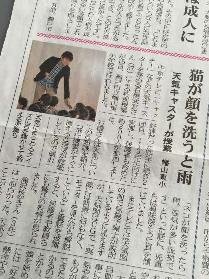 2月15日に行われたお天気キャスター石橋さんによる授業の様子が、中日ホームニュースで紹介されました。2回行ったことで全校児童が石橋さんによる授業を受けることができました。今後もいろんな方にお願いして、直接子どもたちに語っていただければと考えています。本当にありがとうございました!