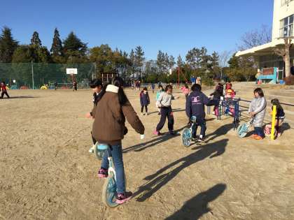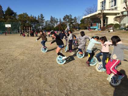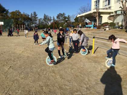 30分休みは全校で縄跳びをやっていますが、それ以外にはサッカーをやったり、遊具に登ったりといろんなことで遊んでいます。そんな中、一輪車を練習している人たちもいます。一輪車はバランス感覚を鍛える上でも有効なようです。