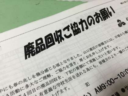 生活部の部長さんと打ち合わせ 公開日 2016/03/10 更新日 2016/03/10 PTA広報部 昨日の夕方、生活部の部長さんと打ち合わせすることができ、来年度の予定や「廃品回収」という名称を「資源回収」に変更するなど、非常に有意義な話し合いができました。また、終わったあとは、掲示板もご覧いただけました。1年間、よろしくお願いします。 いいね(0)