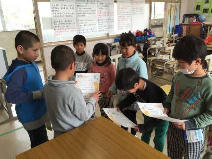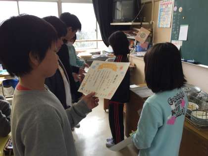 先日行われた縄跳び大会ですが全体表彰だけでなく、学年の組み合わせ(6年生と1年生、5年生と2年生、4年生と3年生)ごとにもぜひ表彰してあげたいという思いから、体育委員会の人たちが各教室を回って表彰してくれました。ありがとう、そして、おめでとう!!