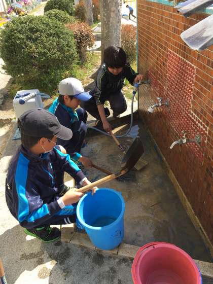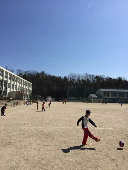 春の陽気の中で金管バンド、バスケット部、サッカー部が活動をしていました。それぞれの部活が目標を立てて頑張っています。また、2枚目はサッカー部の練習に参加するため来校した卒業生が水場の掃除をしてくれました。ありがとう!