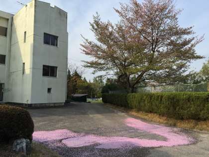 風で散った桜の花びらが絨毯(じゅうたん)のように、地面を敷き詰めていました。また来年の春もきっと見る人を感動させてくれると思います。
