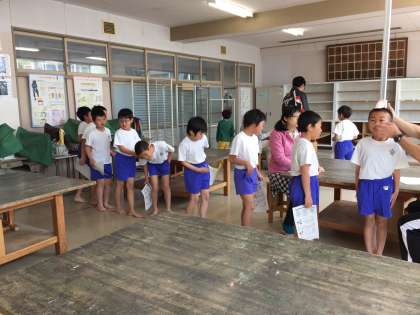 先週から身体計測、視力、聴力などの検査が行われています。たくさんの人が一度に検査をするので、時間もかかりますが、待っている人、終わった人などが非常に静かに待機、移動などをしています。子どもたちはとっても立派です!