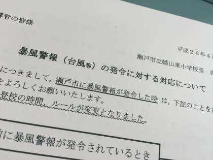 地震が起きたり、暴風警報が発令されたりしたときの対応について、プリントを配布しました。また、緊急時にともなう連絡を確実に行うため、メール配信についてのプリントも配布しました。