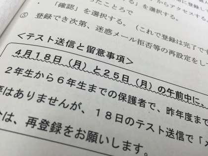 確認方法として最初に18日の午前中テスト送信をしますので、届かない場合は再度登録をお願いします。2回目のテスト送信は25日の午前中に行います。ご理解とご協力をお願いします。
