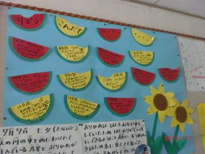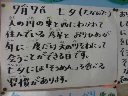 今日の七夕給食 公開日 2016/07/07 更新日 2016/07/07 給食室より 今日は七夕ですね。七夕は天の川で離ればなれに住んでいる、 彦星とおりひめが年に一度だけ、天の川を渡って会うことが できる日です。 今日の給食は七夕にちなんで、七夕ゼリーとそうめん入り とうがん汁が出ました。古い昔から七夕の日にはそうめんを 食べる習慣が地域であるそうです。 しかも今日の給食のお汁の中にクラスで1つだけ星形の ニンジンが入っています。さあ、誰にあたるでしょうか? いいね(0)