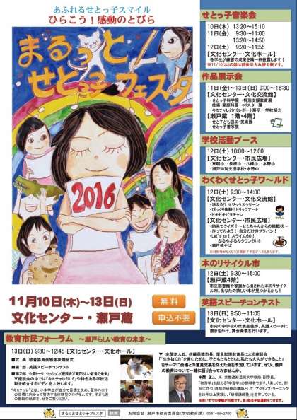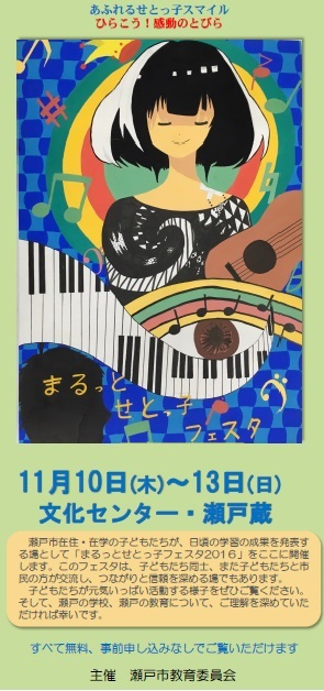「まるっとせとっ子フェスタ」 公開日 2016/10/27 更新日 2016/10/27 地域とともにある学校 毎年恒例となりました「まるっとせとっ子フェスタ」が11月10日から13日まで行われます。 本校の子どもたちの様子も作品展や音楽会、スピーチコンテストなどでご覧いただけます。また、11月13日には幡山東小学校の映像も上映されます。ぜひ足をお運びください。 詳しくは、ホームページ右側にある配布文書の「まるっとせとっ子フェスタ」「教育市民フォーラムチラシ」をご覧ください。 いいね(0)