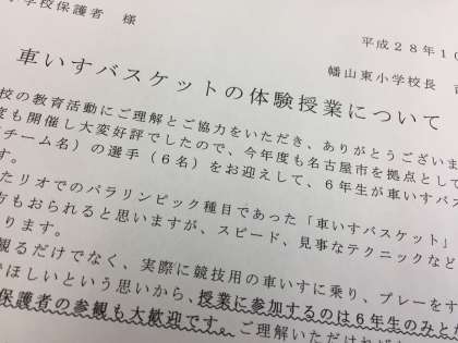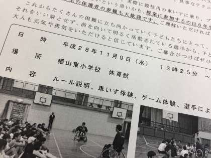 来週(11月9日)水曜日の午後から、車いすバスケットの選手を6名お招きをして、6年生が車いす体験などを行います。すでに写真のような案内を配布してありますが、6年生以外の保護者の見学も大歓迎です。駐車場はありませんが、ご都合がつくようであればぜひお越しください。