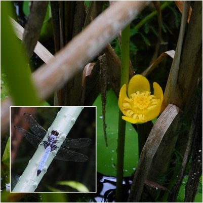 耳を澄ますと草むらから,虫の声が聞こえるようになってきました。観察池でかわいい黄色の花をみつけました。河骨(コウホネ)という睡蓮の仲間の水草です。水中の茎や根が骨のように見えるので名づけられました。解熱の漢方薬にも煎じられるようです。近くにはシオカラトンボがいました。