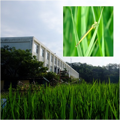 イトトンボが稲の葉先にとまっていました。稲穂はまだ見つけられません。