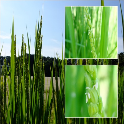 稲がさかんに花を咲かせています。写真は開花し受粉を終えた実(籾:もみ)です。稲はほんの数時間しか花を咲かせません。