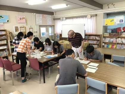 英語の授業がより本格的に導入されることを想定し、ALTの先生に来ていただき少人数で英語の研修を行いました。楽しく英語を学ぶためのノウハウを教えていただきましたので今後に生かしていきたいと思います。