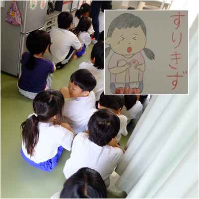 身長・体重の測定だけでなく,運動会の練習が多くなるこの時期,けがの応急処置についての話が養護の先生からありました。
