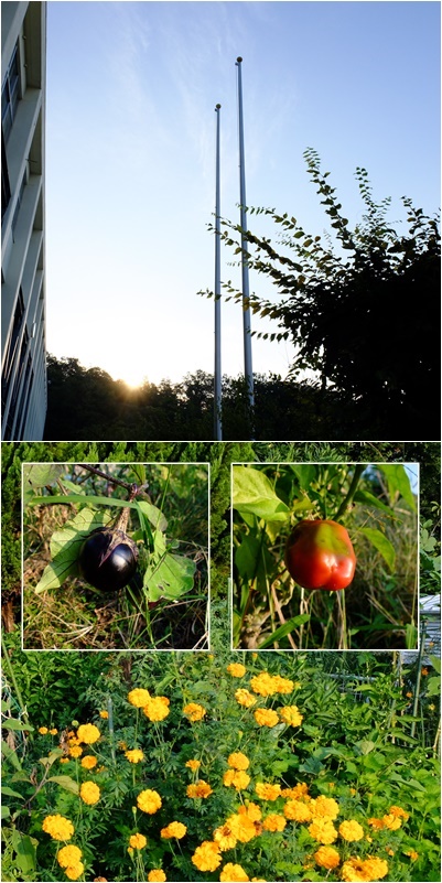 日の出の時刻も遅くなってきました。東の森から朝日が昇りました。ピーマンが真っ赤にパプリカのようでした。