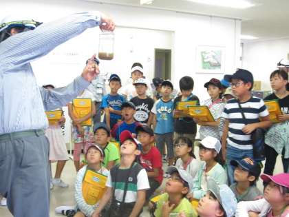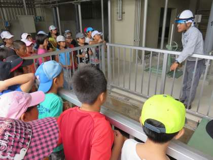 職員の方にそれぞれの工程でどんなことをして水をきれいにするのかを聞き、それぞれの工程を経た水を見させていただくこともできました。初めと最後の水のにおいを嗅いだ子たちは最後の水のにおいを嗅いで、「すごい!もうほとんどにおわない!」と目を丸くしながら言っていました。