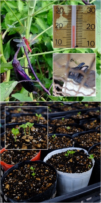 秋茄子に赤とんぼがとまっていました。もみじ組がポットに蒔いた葉牡丹があっという間に芽を出しました。