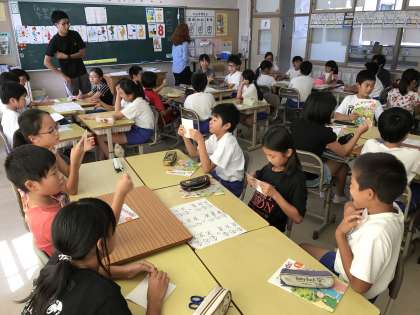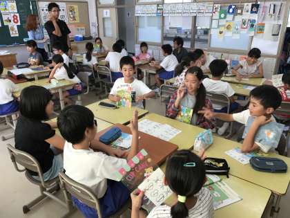 ALTの先生と英語の授業 公開日 2017/09/08 更新日 2017/09/08 5年生 金曜日はALTの先生が来校してくださっています。写真は5年2組の授業風景です。みんなとっても楽しそうです!! いいね(0)