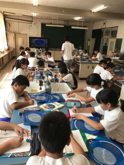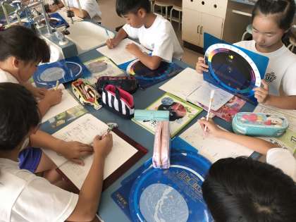 理科室で4年1組が星の勉強をしていました。いろんなことに興味を持ってほしいと願っています。