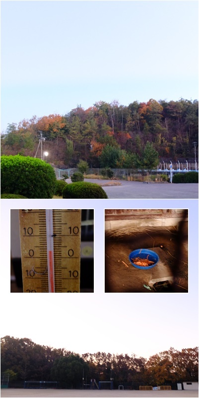おだやかな朝です。校舎裏の林,晩秋を迎え黄に色づいています。今朝はうさぎたちの姿がみえませんでした。