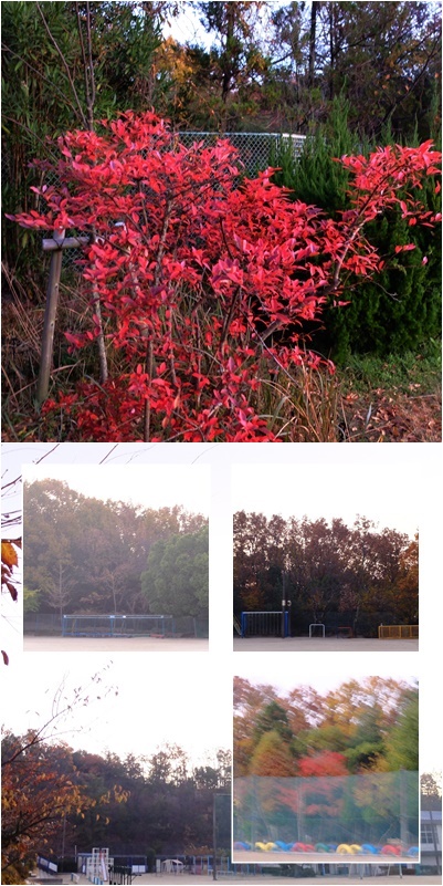 今一番鮮やかに染まっているのがブルーベリーです。真っ赤に色づいています。来夏,おいしい実がなりますように・・・。