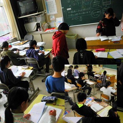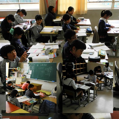 5年生は分数の割り算,4年生は少数の割り算,どちらも割り算の単元です。クラスを二つに分けての少人数の授業,集中して問題に取り組んでいました。