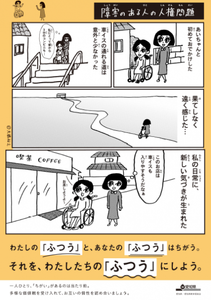 真ん中のコマ割り,(家から3分のコンビニも・・・),果てしなく遠く感じた。そして最後のコマ割り,「わたしの日常に新しい気づきが生まれた」と記されています。わたしたちの「ふつう」を増やすために,新しい気づきをみつけられる力を磨いていこうと訴えているようです。
