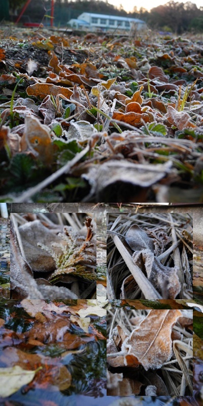 落ち葉に霜が降りました。寒暖計は0度近くです。氷ははっていませんでしたが,冷え込んでいます。