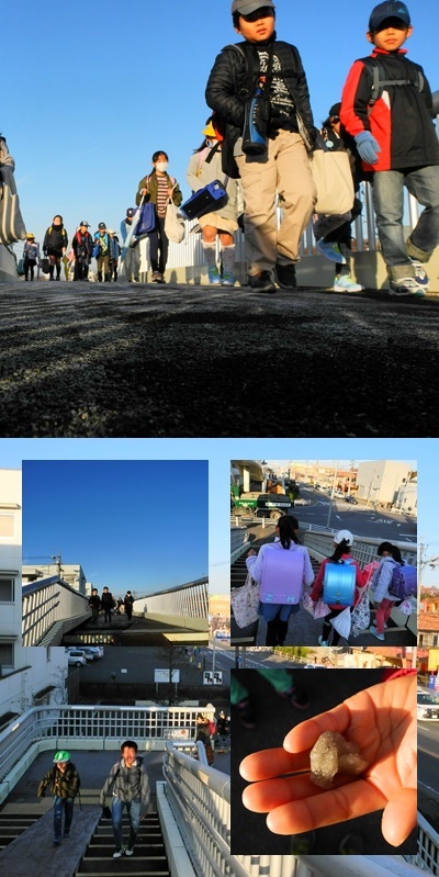 今季一番の冷え込みだったようです。歩道橋は全面に霜が降りうっすらと白くなっています。霜をかき集めて氷の球をつくっている子がいました。