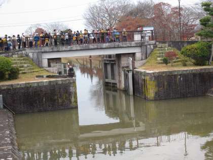 船頭平閘門では、4つのグループに分かれてガイドの方から閘門の役割や仕組みについて説明していただき、子どもたちも熱心にメモをとる姿が見られました。途中、船が閘門を通過する場面にも立ち会うことができました。船が通るのは1日平均でも2、3回しかなく、通らない日もあるそうです。子どもたちは貴重な場面に立ち会うことができ、大興奮しながら見ていました。