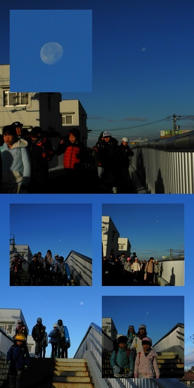 登校時間。欠け始めた月が真西の空に輝いていました。歩道橋を渡る子たちの上には月が浮かんでいます。日が昇るのが遅い冬だからこそかもしれません。