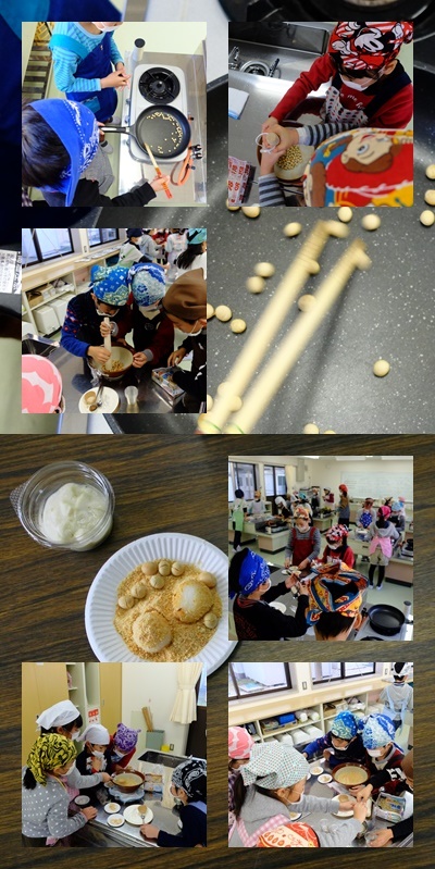 地域のお豆腐屋さんからいただいた豆乳で豆腐をつくりました。節分でおなじみの煎(い)り豆をつくりました。煎った大豆を擂(す)り鉢であたりきな粉をつくりました。