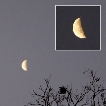 わずかに葉を残した紅葉(もみじ)のえだの上に下弦に向かう月が輝いていました。