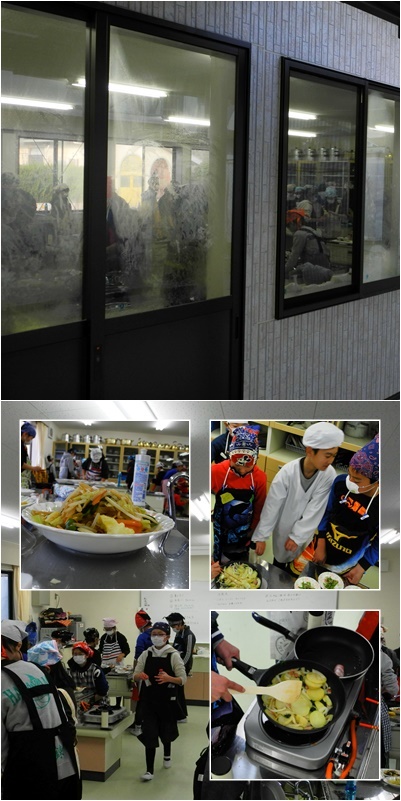 午後も家庭科室の窓が曇っていました。昨日に引き続き6年生,今日は2組が調理実習を行いました。