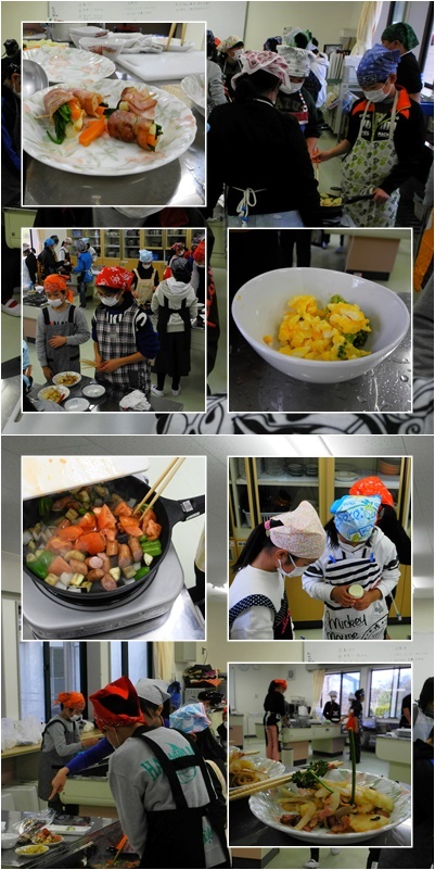 できあがる料理の種類の多さにびっくりします。トマトを炒めてフランス料理のラタトゥイユをつくるグループもあります。この経験をいかして,ぜひおうちでも家族にふるまってほしいなと思いました。