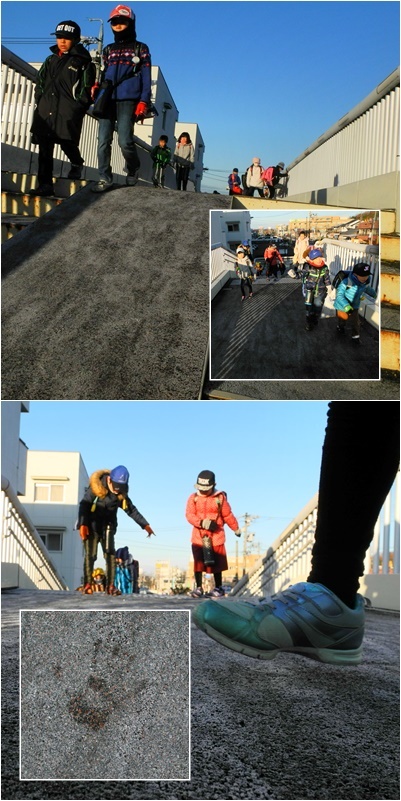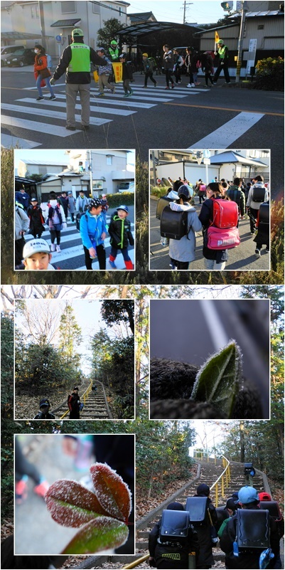 歩道橋にもたっぷりと霜が降りています。手形をつけたり,靴で霜を集めたり・・・,とっても冷たいけれど,喜んでいる子が多いです。いつも以上にあいさつが明るく元気です!