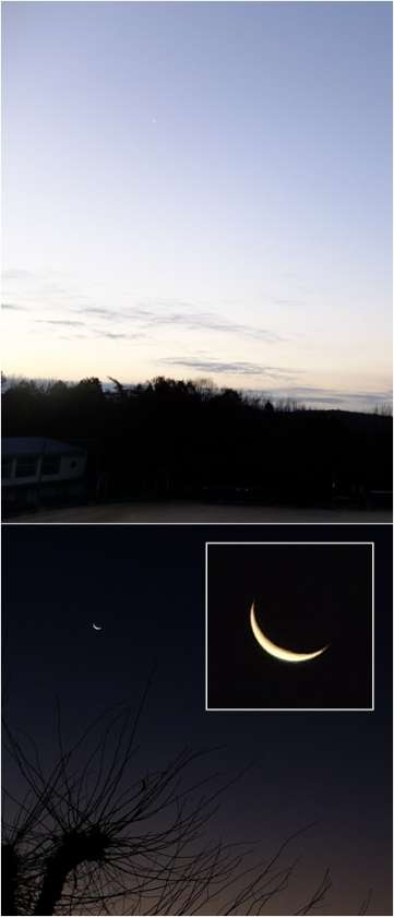 昨日ほどの冷え込みはありません。とってもやせて細くなった月が東よりの空にありました。