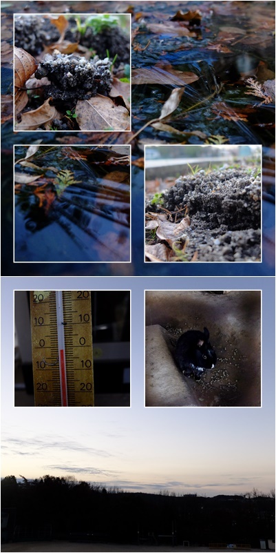 色のなくなった運動場,今日は学級園に霜柱がたちました。