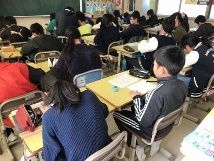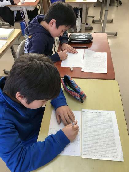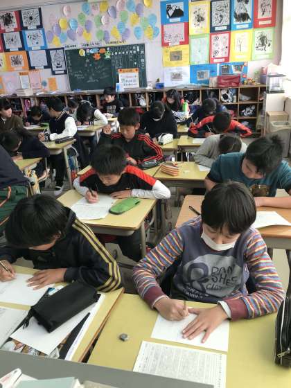6年1組が緊張感の漂う中、卒業文集を書いていました。みんな真剣です!