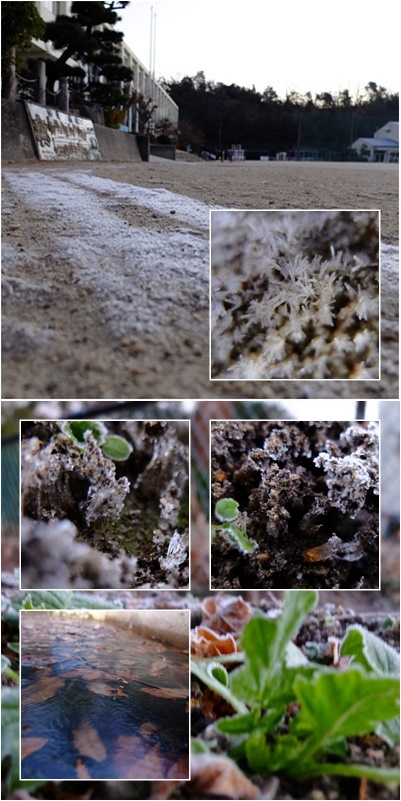 たっぷりと霜が降りました。畑では霜柱がたっています。歩道橋も,きっと真っ白になっていることでしょう。