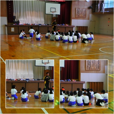 2組は体育の授業です。ちょうどまとめになっていて・・・。先生のお話の最中でした。でも落ち着いてお話が聞けています。すばらしいです。