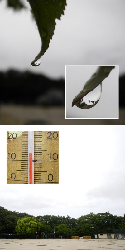 昨日は雨上がりでしたが,今朝は雨の朝です。葉っぱについた雫が遠くの景色を映しています。