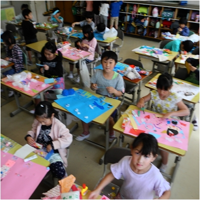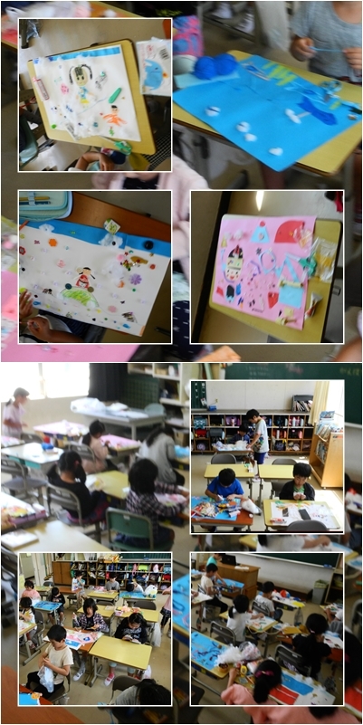 3・4時間目,2年生の図工の授業です。いろいろな素材を使って作品を仕上げる「ざいりょうからひらめき」が完成しました。
