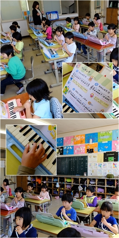 2年生の音楽の授業です。けん盤ハーモニカでタンギングの練習です。曲は不思議な歌詞の「アチャ パチャ ノチャ」です(写真は2年生3組です)。