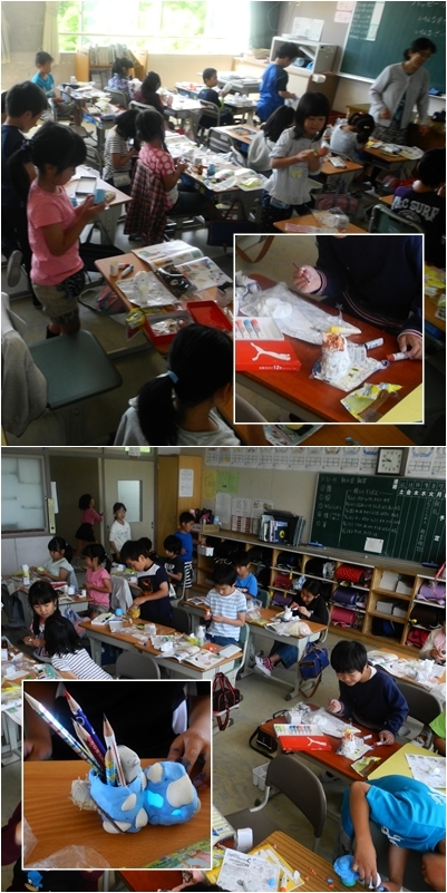 3年生の図工の授業です。紙粘土に絵の具を混ぜてペットボトルなどにはりつけて,ペン立てなどを制作します。それぞれの工夫が光ります(写真は3年生1組です)。