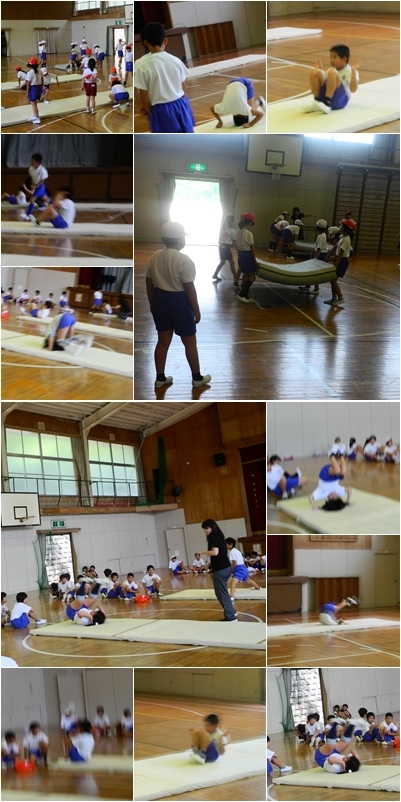 今日の種目は後転です。手のつき方・押し出し方,回転のスピード,腰の曲げ方・伸ばし方,さまざまな要素の組合せできれいな後転になります。