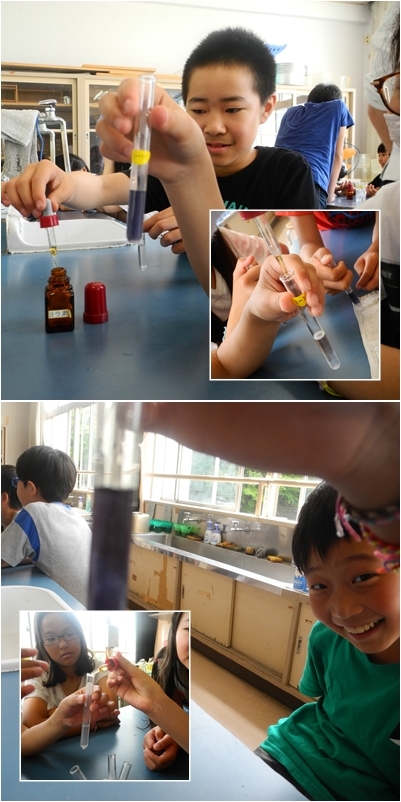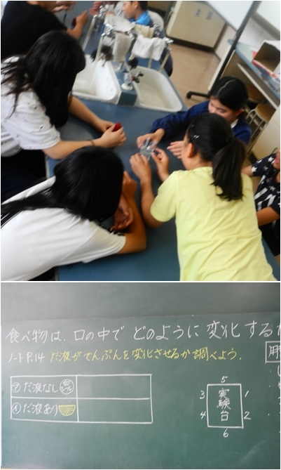 唾液がでんぷんを溶かして,別のものに変身させます。でんぷんに唾液を加えしばら置くと,ヨウ素液を入れても青紫にならなくなります。