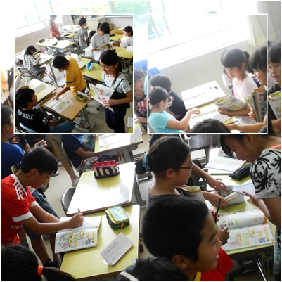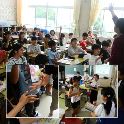 「rock sizer paper」をやっています。日本語訳をすれば「ぐー ちょき ぱー」です。言葉の並びが一緒なのが興味深いですね。楽しく英語を学びます。ゲームが終るとすっと椅子に座り,先生の話が聞けます。さすが5年生!