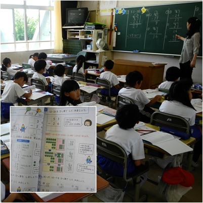 2年生,算数の授業です。二桁の数の引き算をひっ算で解きます。